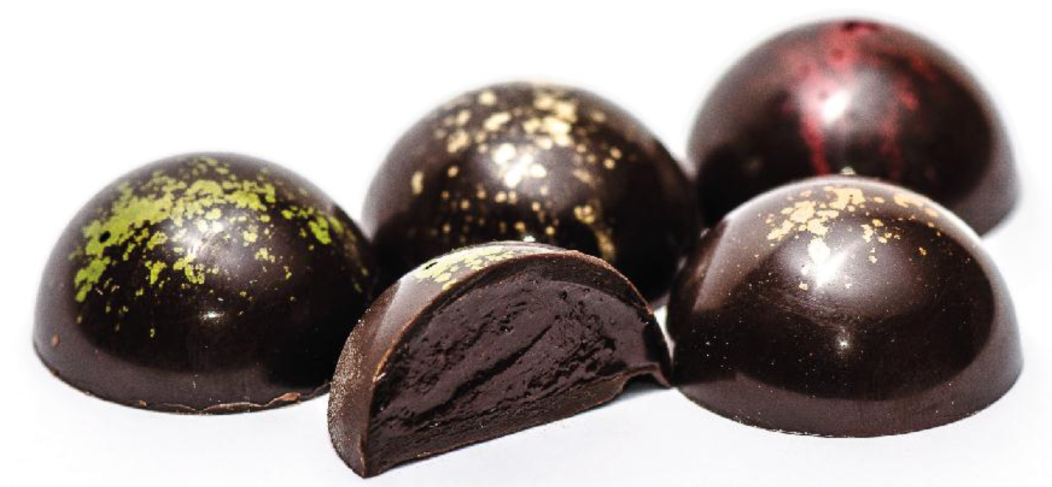 - Ganache chocolate e cereja do Fundão, coberto de uma fina camada de chocolate negro