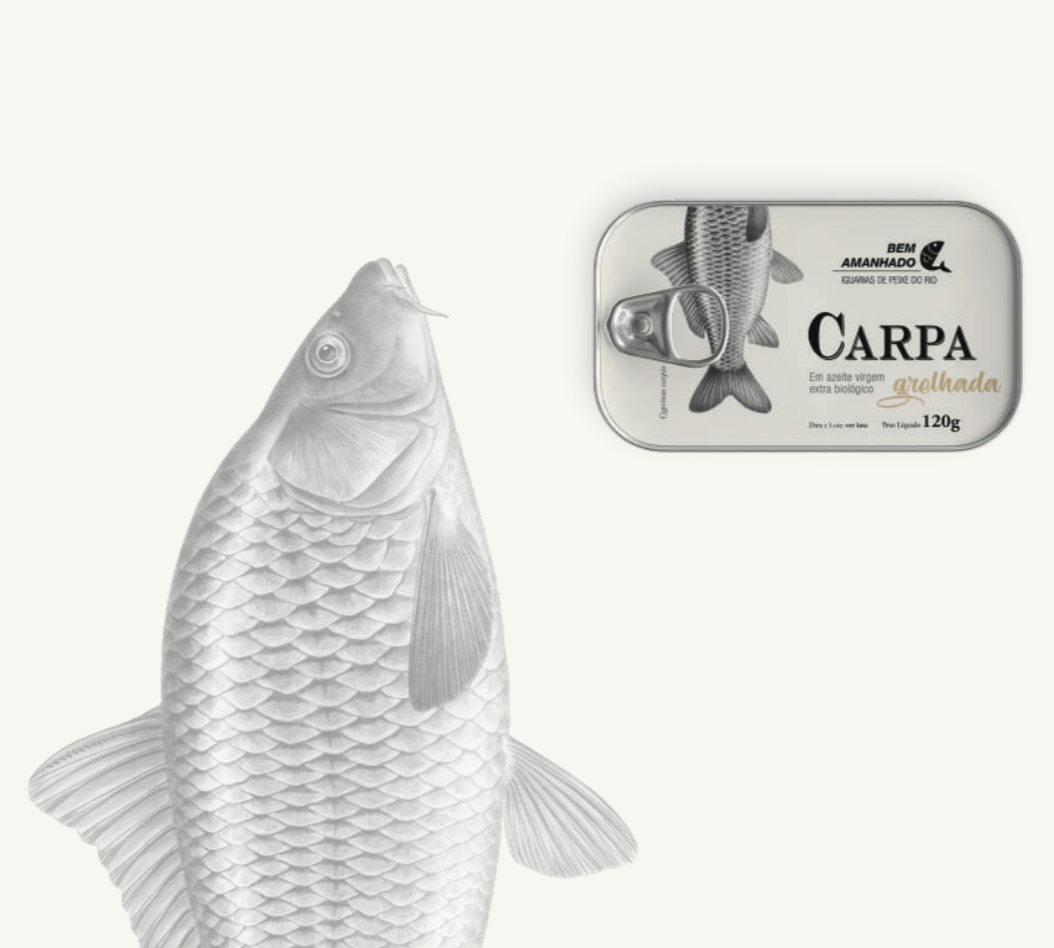 Carpa grelhada em azeite virgem extra biológico. Uma conserva de peixe do rio que associa formas de confeção a baixa temperatura, que melhor preservem e mantenham a qualidade organolética do produto.