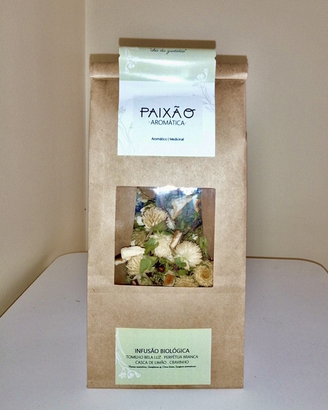 Ingredientes: tomilho bela luz, perpétua branca, casca de limão e cravinho, (Thymus mastichina, Gomphrena sp, Citrus limon, Syzygium aromaticum).