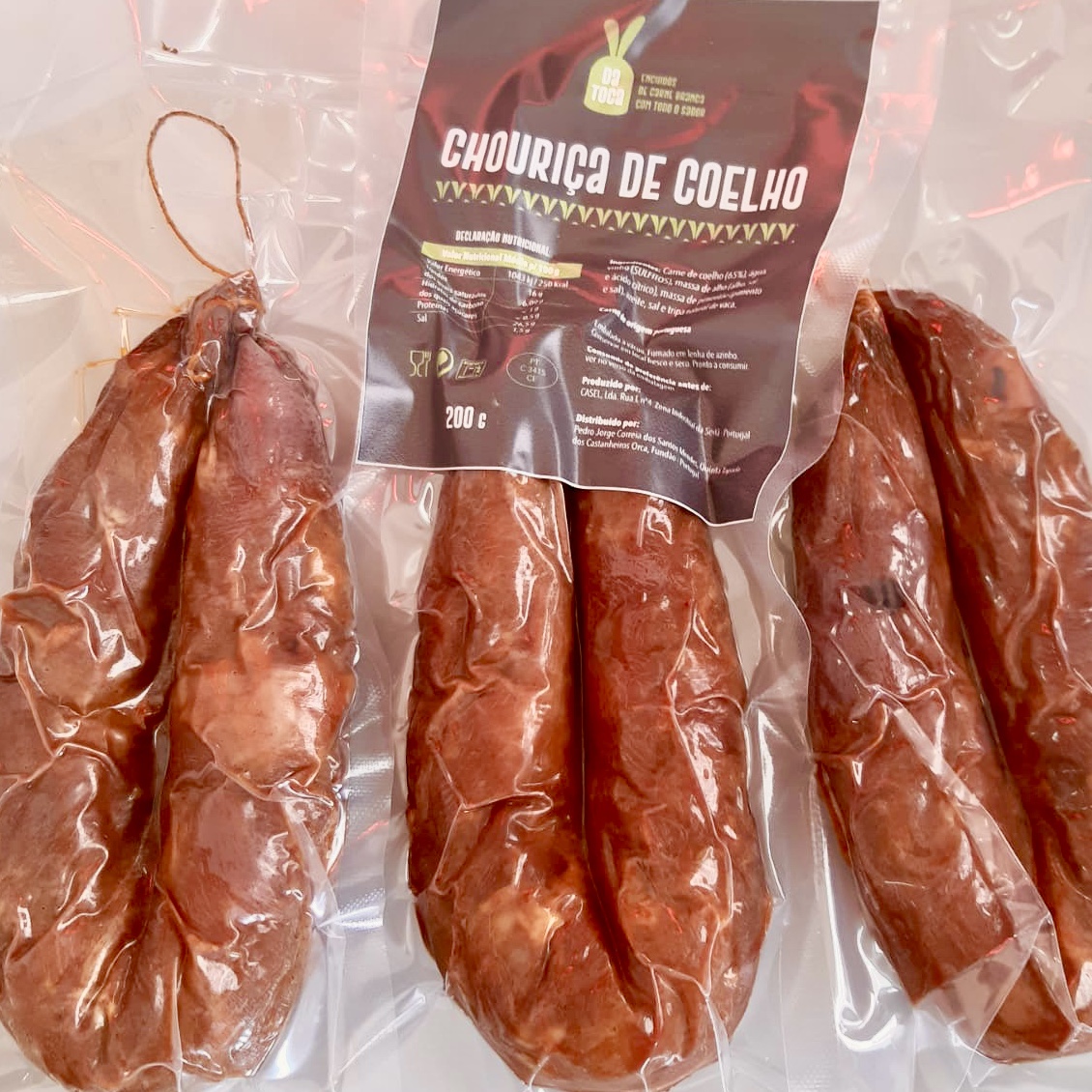 Carne de coelho (65%), água, vinho (SULFITOS), massa de alho (alho, sal e ácido cítrico), massa de pimentão (pimento e sal), azeite, sal, tripa natural de vaca.