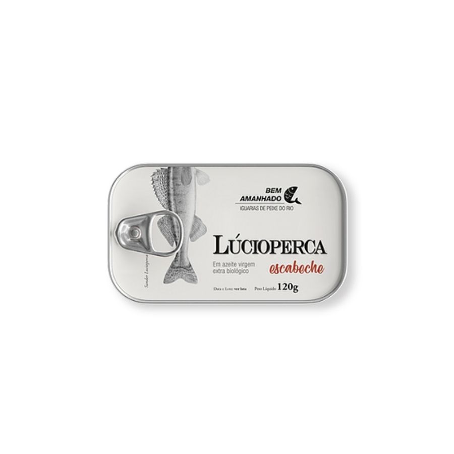 Escabeche de Lúcioperca em azeite virgem extra biológico. Um peixe de água doce em conserva preparada e confecionada através de métodos artesanais e tradicionais da cozinha portuguesa.